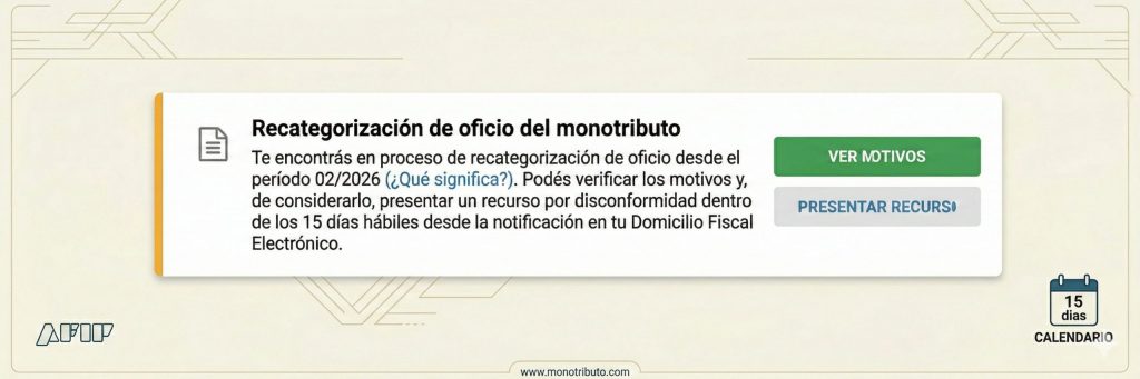 Si estás dentro de un proceso de recategorización de oficio, no podés darte de baja hasta que finalice el procedimiento. La baja solo puede realizarse cuando cesa la actividad (dejas de facturar y recibir ingresos) y al mes siguiente.
